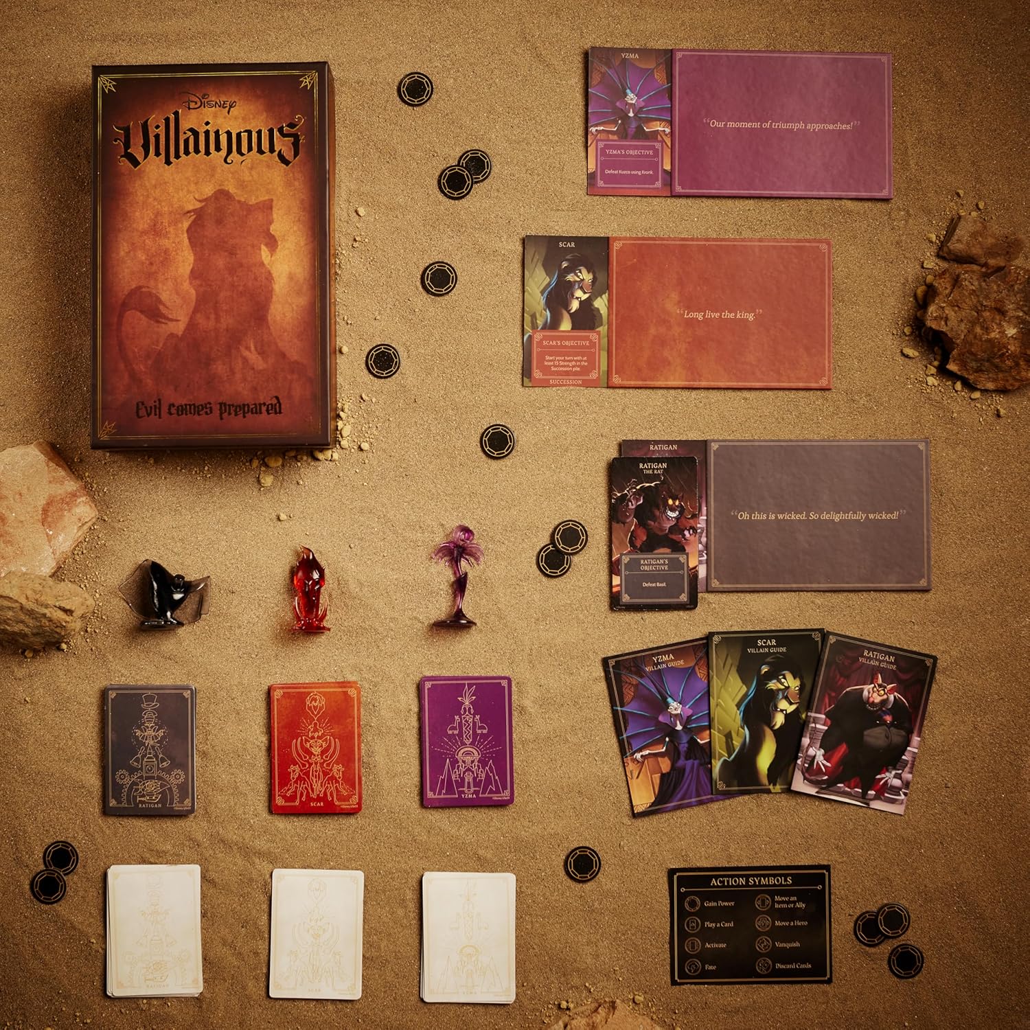 Unleash your inner villain in Disney Villainous: Evil Comes Prepared. Choose to play as the cunning Scar, Ratigan, or Yzma, each with distinct abilities and goals to achieve. Navigate the twists of fate as you encounter iconic heroes like Mufasa, Simba, Basil, and more, who will challenge your diabolical plans. Utilize the included villain guides to master each character's unique strategies for endless replayability. Evil Comes Prepared can be enjoyed as a standalone game or combined with other Disney Villainous sets for even more villainous fun Suitable for kids ages 10 and up, with a playing time of 40 to 60 minutes.