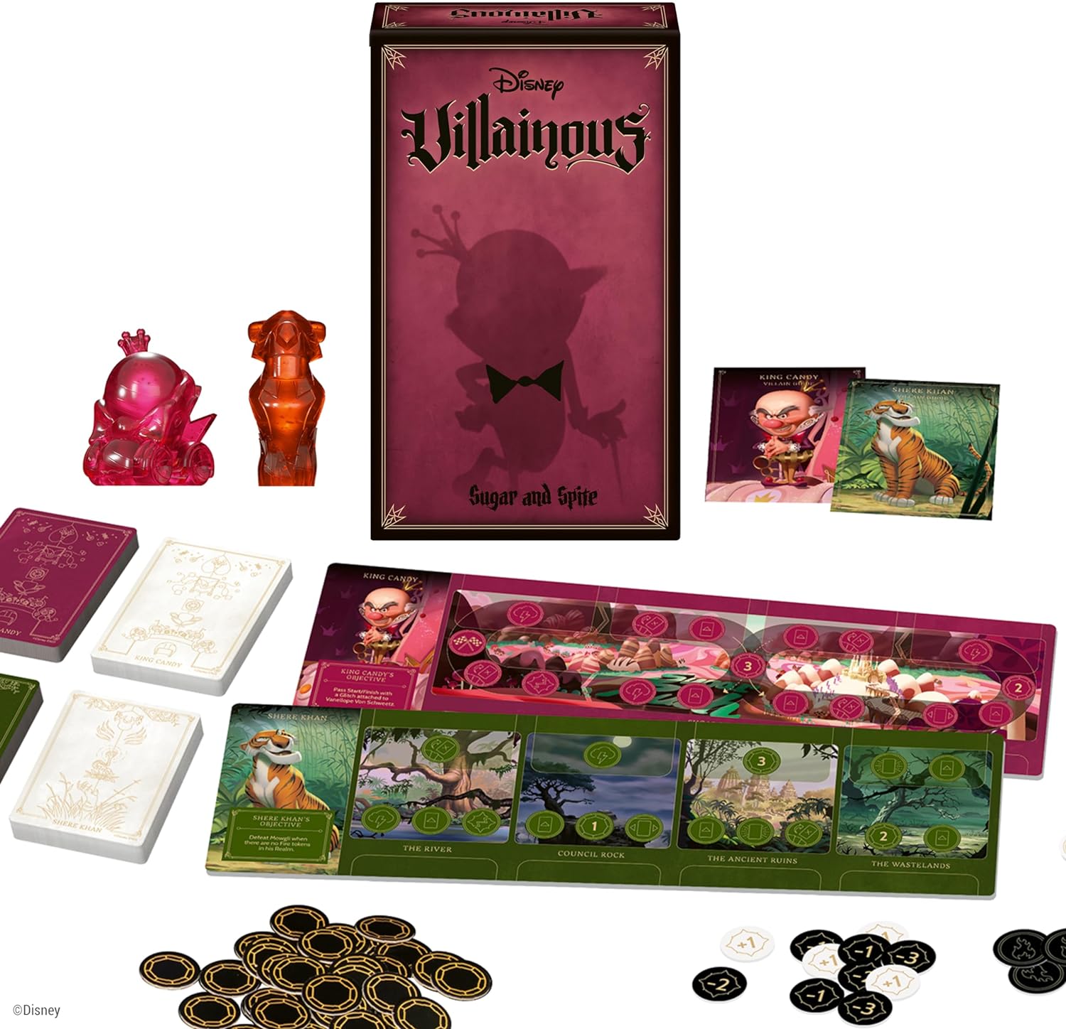 Unleash your inner villain in Disney Villainous - Sugar & Spite. Choose to play as the cunning King Candy or the devious Shere Khan, each with distinct abilities and goals to achieve. Navigate the twists of fate as you encounter iconic heroes like Baloo and Kaa, and antagonists like Princess Vanellope, and more, who will challenge your villainous plans. Utilize the included villain guides to master each character's unique strategies for endless replayability. Sugar & Spite can be enjoyed as a standalone game or combined with other Disney Villainous sets (Filled with Fright, Evil Comes Prepared, or Wicked to the Core) for even more sinister fun Suitable for kids ages 10 and up, with a playing time of 40 to 60 minutes.