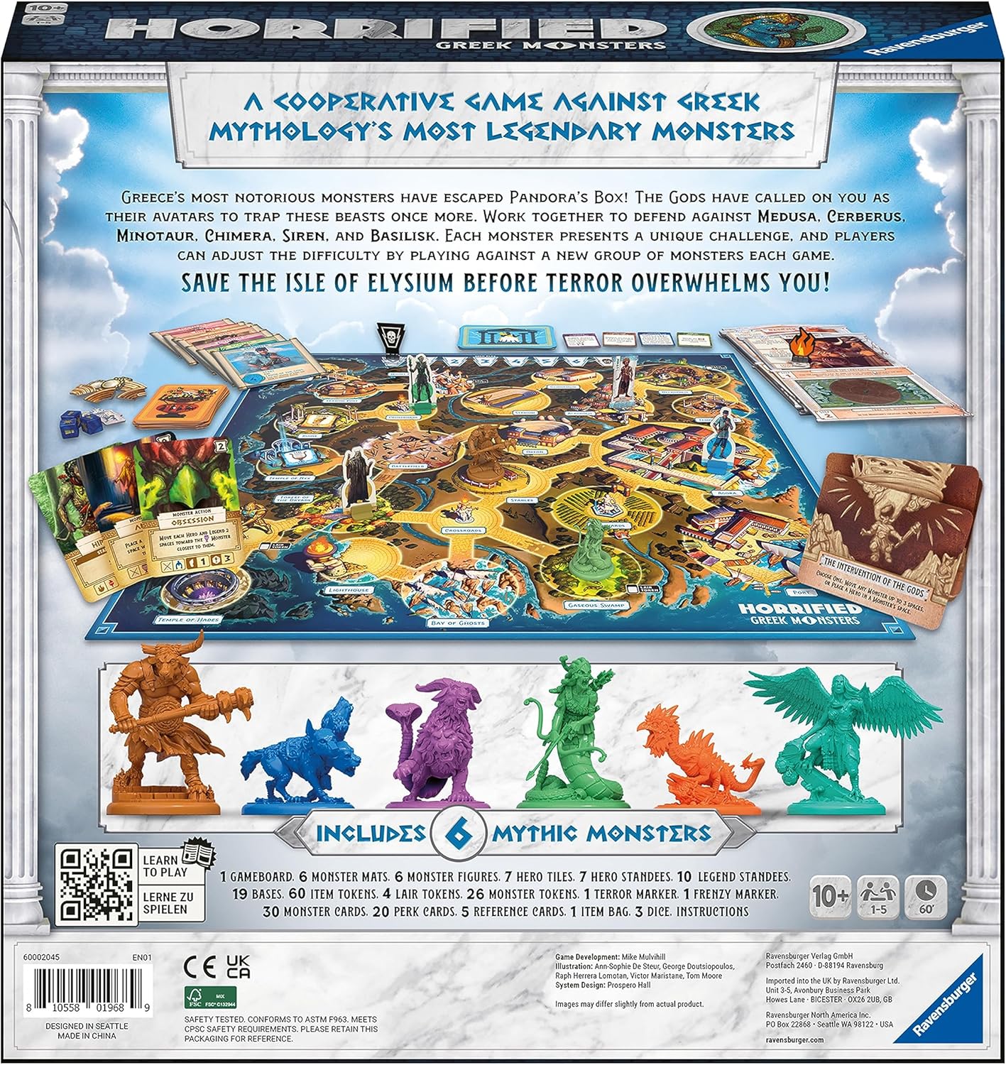 Dare to enter the underworld of Ravensburger Horrified - Greek Monsters, a cooperative strategy board game for kids and adults, where you and your friends must protect Elysium from 6 of the most terrifying creatures ever imagined Face the unique challenges of Medusa, Cerberus, Minotaur, Chimera, Siren, and Basilisk - all who have escaped from Pandora's Box. Work together to save the Isle of Elysium from a tragic end. Perfect for birthday and holiday gifts, parties, family game nights or gatherings with friends, Horrified - Greek Monsters offers thrilling gameplay for 1-5 players and lasts approximately 60 minutes. The game is easy to learn with clear and concise instructions, allowing both seasoned strategists and newcomers to jump right into the action.