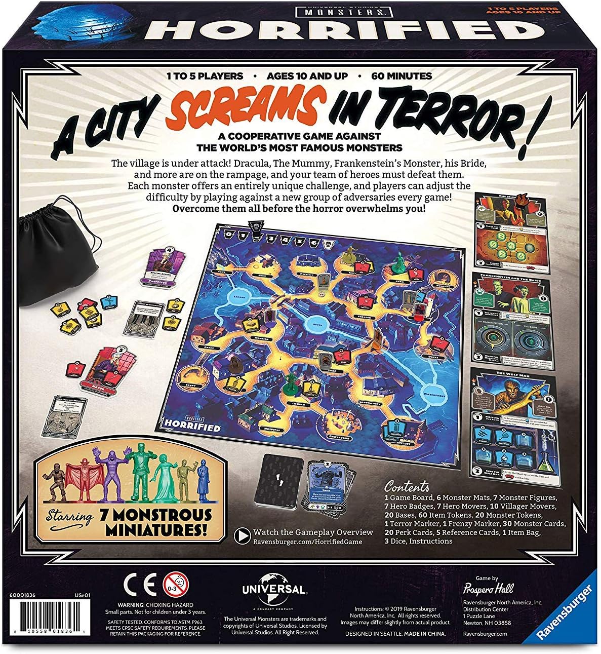 Dare to enter the world of Ravensburger Horrified - Universal Monsters, a cooperative strategy board game for kids and adults, where you and your friends must protect your town from seven of the most terrifying creatures ever imagined Face the unique challenges of Frankenstein, Dracula, the Bride of Frankenstein, the Wolfman, the Mummy, the Invisible Man, and the Creature from the Black Lagoon. Each monster requires a different strategy, making every game a fresh and exciting experience.