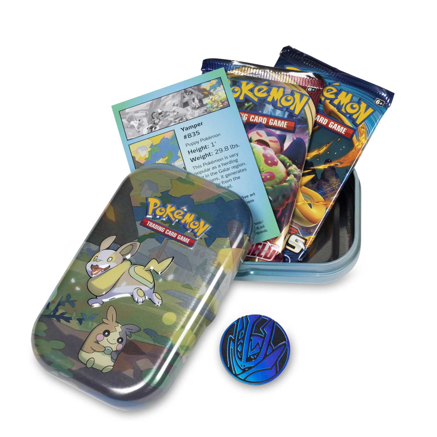 Expand your collection with this Pokémon Trading Card Game: Galar Pals Mini Tin, perfectly sized for taking your favorite cards on the go! This fantastic tin is easy to open and features Yamper & Morpeko in one of five fun Pokémon illustrations—and all five form a single image when you line them up!